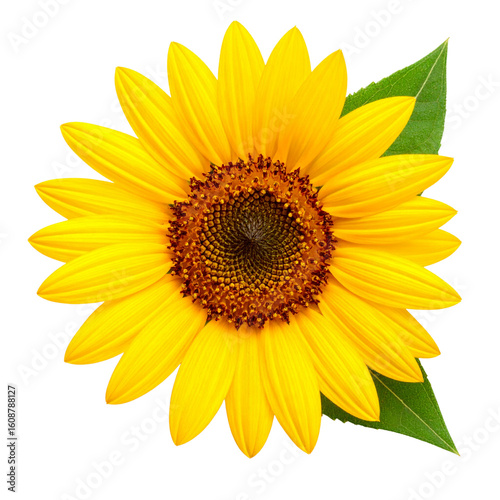 Fototapeta premium Beautiful bright yellow sunflower blossom with green leaf isolated on white background