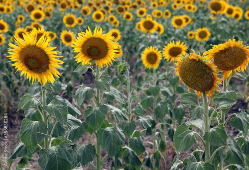 Fototapeta premium Beautiful bright yellow sunflowers in a large field in farming country near...