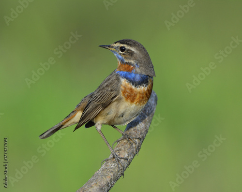 Obraz premium Beautiful brown bird with blue and orange feathers on its hest perching on branch turn his face around over blur green background, Bluethroat (Luscinia svecica)