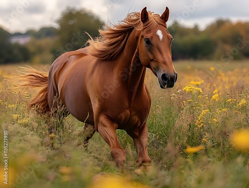 Obraz premium Beautiful brown horse cantering a grassy field mane flowing in the wind...