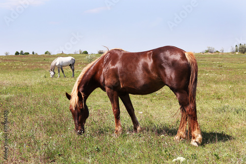© Africa Studio, Obraz premium Beautiful brown horse grazing on meadow