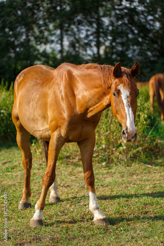 © serkucher, Fototapeta premium Beautiful Brown Horse in a Green Field