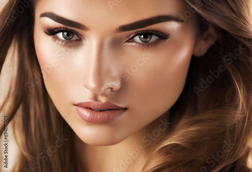 Obraz premium Beautiful brunette girl in move with a perfectly smooth hair and classic make-up. Beautiful face from close.