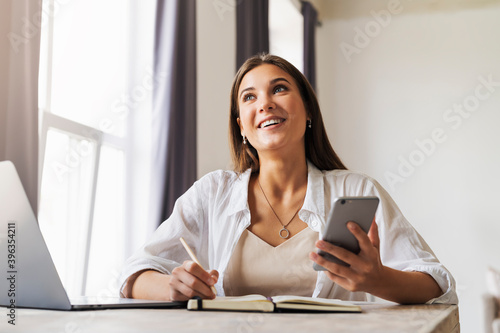 Obraz premium Beautiful brunette girl rejoices uses gadgets. Online training, remote work from home. Business woman sits at table
