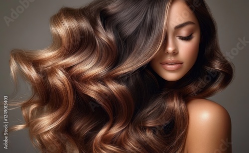 Obraz premium Beautiful brunette girl with long shiny wavy black hair in high fashion editorial style soft curls
