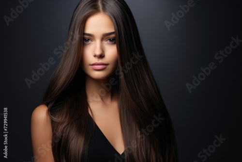 Fototapeta premium Beautiful brunette girl with long, smooth, healthy hair on a dark background