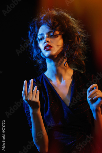 Fototapeta premium beautiful brunette in the glow of blue and red light