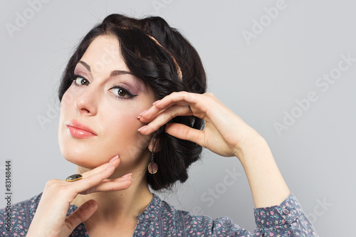 © rubchikova, Obraz premium Beautiful brunette on a gray background