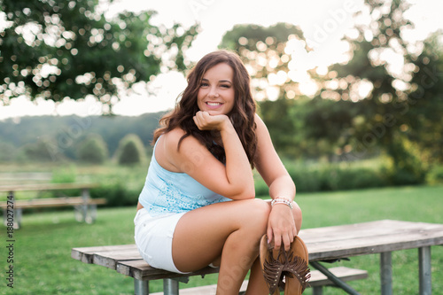 © Mary Perry, Naklejka premium Beautiful brunette teen woman outside on a summer day