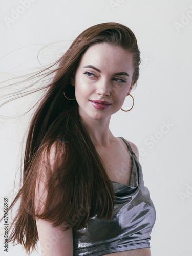 Fototapeta premium Beautiful brunette woman girl with long hair smooth and beauty in silver wear