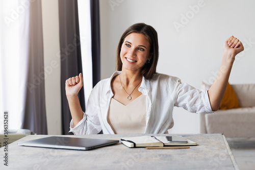 Obraz premium Beautiful brunette woman has completed business project, is happy. Girl sits at desk in home office. Distance work