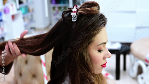 Naklejka premium Beautiful brunette woman in a beauty salon.