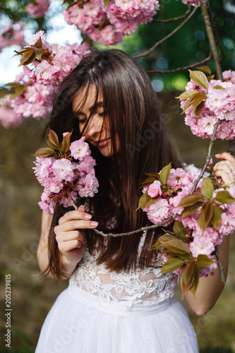 Obraz premium Beautiful brunette woman smells pink flowers on blooming sakura tree