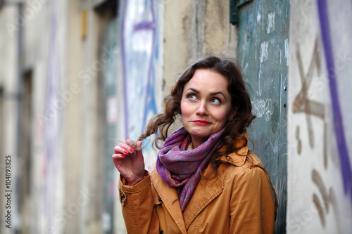 © ginkgofoto, Fototapeta premium Beautiful brunette woman smiling and playing with her curly hair
