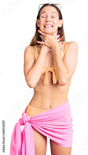 Fototapeta premium Beautiful brunette young woman wearing bikini and sunglasses shouting and suffocate because painful strangle. health problem. asphyxiate and suicide concept.
