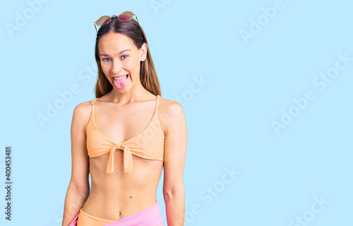 Obraz premium Beautiful brunette young woman wearing bikini and sunglasses sticking tongue out happy with funny expression. emotion concept.