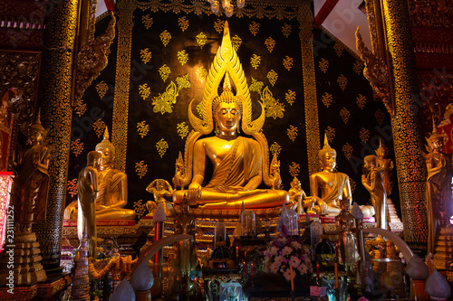 © sakdinon, Fototapeta premium Beautiful Buddha Chinnarat Coated with Gold Plate in Thailand temple