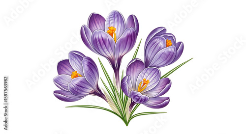Fototapeta premium Beautiful bunch of purple crocus flowers with green stems isolated on...