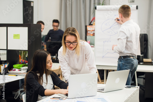 © romankosolapov, Obraz premium Beautiful business people are looking at camera and smiling while standing in office
