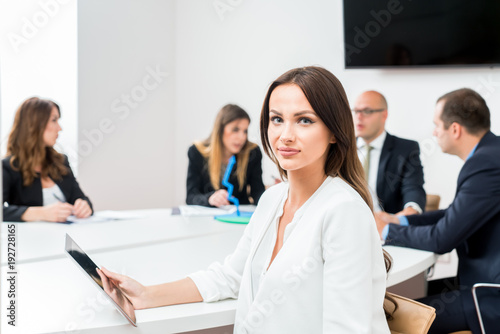 © Senad, Obraz premium Beautiful business woman is looking at camera and smiling while working in office