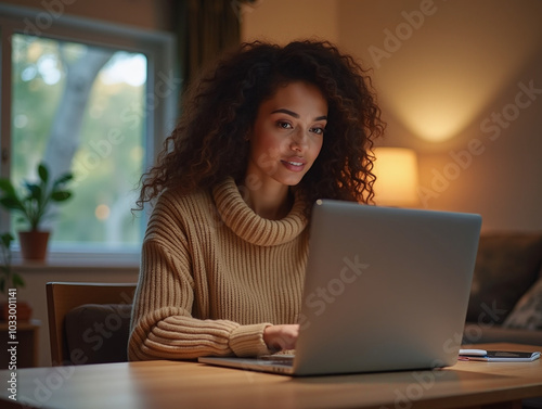Naklejka premium Beautiful business woman using a laptop computer and drinking coffee, sitting...