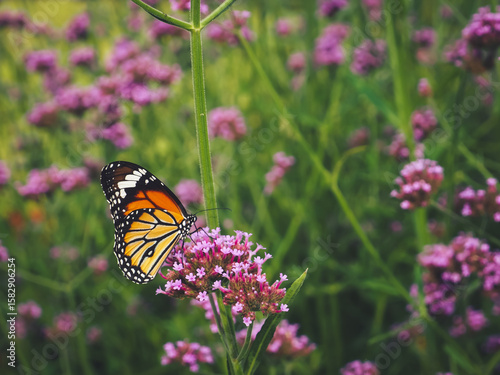© MothelifeStudio, Naklejka premium Beautiful butterfly in the garden perched on a purple flower.