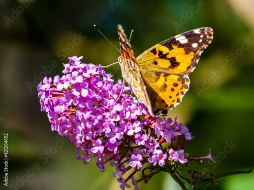 © Gabdulvachit, Obraz premium Beautiful butterfly sitting on purple inflorescence on dark blurred background
