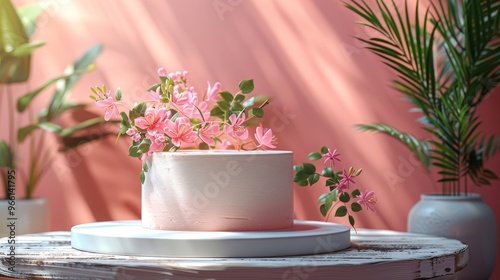 Fototapeta premium Beautiful Cake with Pink Flowers, Vibrant Floral Backdrop for Celebrations and display product.