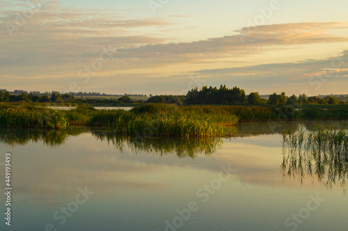 © Payllik, Fototapeta premium Beautiful calm golden landscape at the sunset of the lake