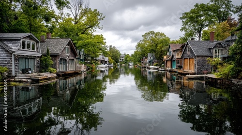 © Tanu, Fototapeta premium Beautiful canal lined with quaint cottages in a serene, cloudy setting