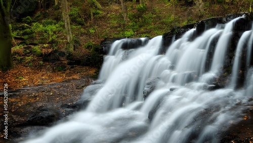 © Koto, Fototapeta premium Beautiful cascading water flows over rocks in a vibrant green forest, creating a serene natural landscape