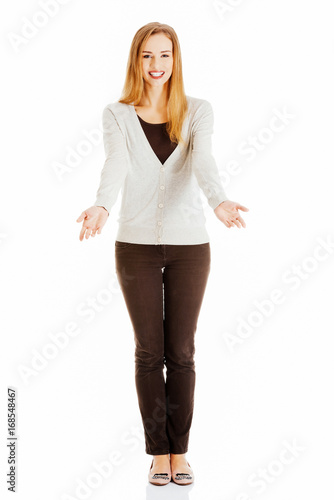 Fototapeta premium Beautiful casual woman is having a copy space on her palms, hand