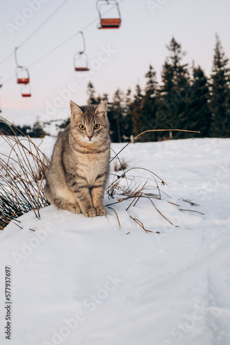 Obraz premium Beautiful cat sits on the snow overlooking the mountains