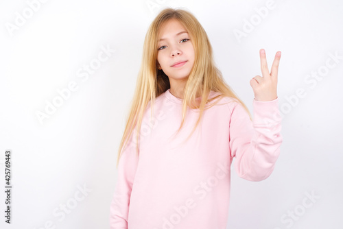 © Roquillo, Fototapeta premium Beautiful caucasian blonde little girl wearing pink sweater smiling and looking friendly, showing number two or second with hand forward, counting down