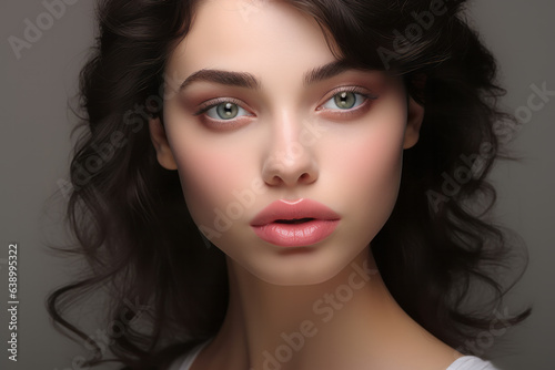 Fototapeta premium Beautiful caucasian brunette woman wiith sexy smile. She is happy that she used the services of your beauty salon or cosmetology clinic. Shows her augmented plump lips, ready to kiss.