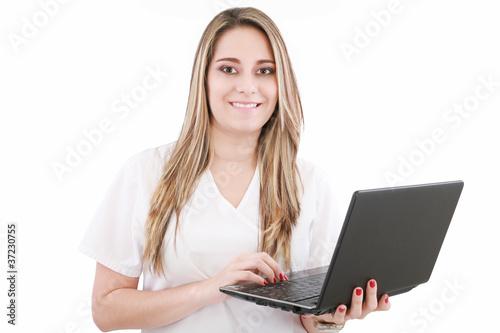 Fototapeta premium Beautiful caucasian doctor or nurse holding a laptop computer