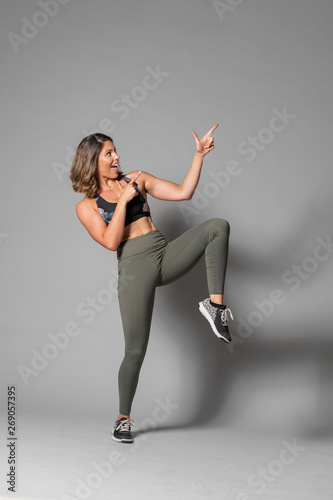 Obraz premium Beautiful caucasian fitness Models does pointing gestures for product or icon placements on a gray background.