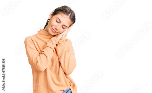 © Krakenimages.com, Fototapeta premium Beautiful caucasian woman with blonde hair wearing casual winter sweater sleeping tired dreaming and posing with hands together while smiling with closed eyes.