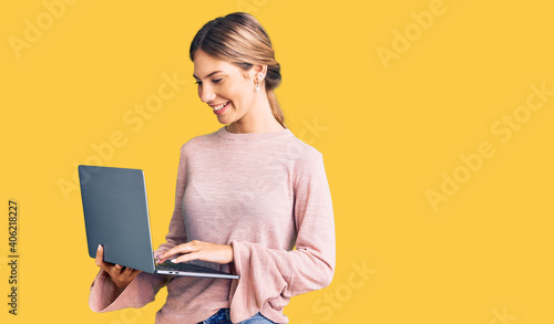 Naklejka premium Beautiful caucasian woman with blonde hair working using computer laptop looking positive and happy standing and smiling with a confident smile showing teeth