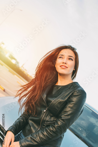 © Galina Zhigalova, Fototapeta premium Beautiful charming brunette long hair young asian woman in black leather jacket near her car