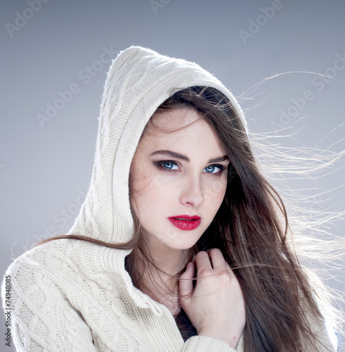 Obraz premium Beautiful charming woman in hood, over blue background.