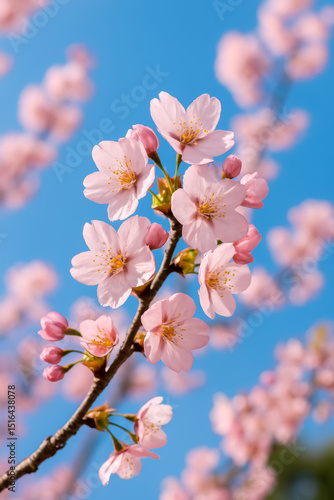 Obraz premium Beautiful cherry blossom flowers in full bloom against blue sky