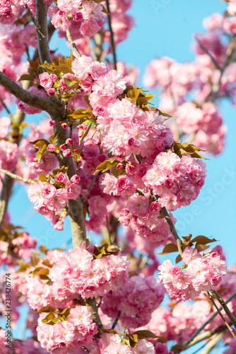 Obraz premium Beautiful cherry blossom , pink sakura flower on nature background - selective focus, vertical orientation