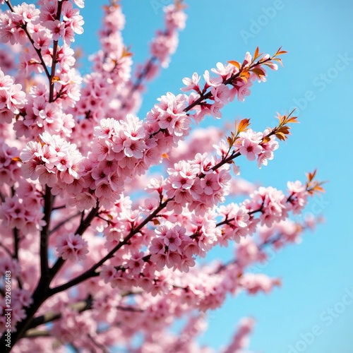 Obraz premium Beautiful cherry blossom tree in full bloom against blue sky, nature,...