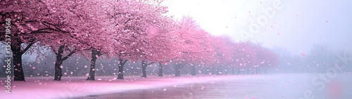 © marwa, Fototapeta premium Beautiful cherry blossom trees line a path with falling petals gently