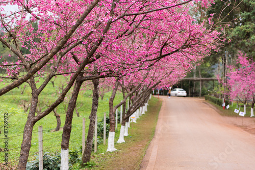 © Krisda, Naklejka premium Beautiful Cherry blossom trees roadside at Ang Khang Hill, Chiang mai, Thailand