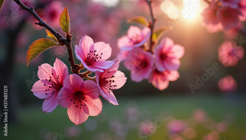 © Natallia, Obraz premium Beautiful Cherry Blossoms Blooming Against a Glowing Sunset, Trees Blooming Timelapse