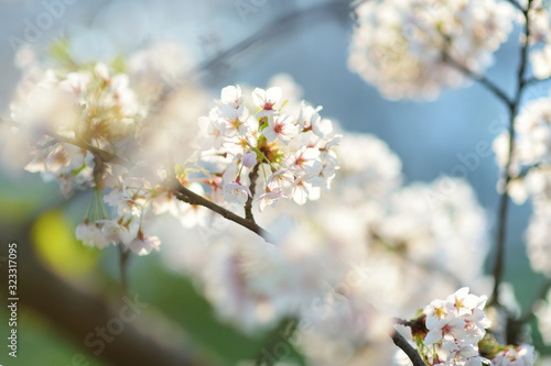 © MNStudio, Obraz premium Beautiful cherry tree blossoming on spring. Beauty in nature. Tender cherry branches on sunny day outdoors.