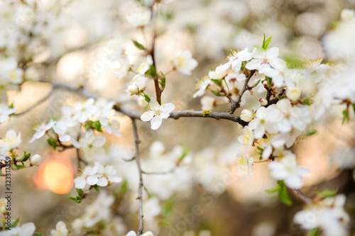 © MNStudio, Obraz premium Beautiful cherry tree blossoming on spring. Beauty in nature. Tender cherry branches on sunny day outdoors.