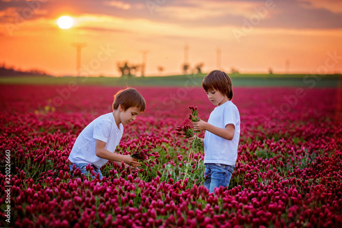 © Tomsickova, Fototapeta premium Beautiful children in gorgeous crimson clover field on sunset